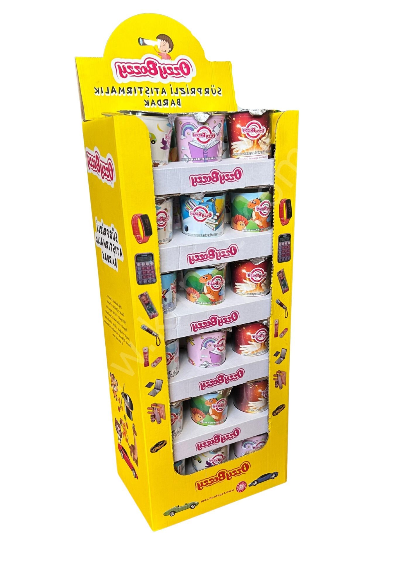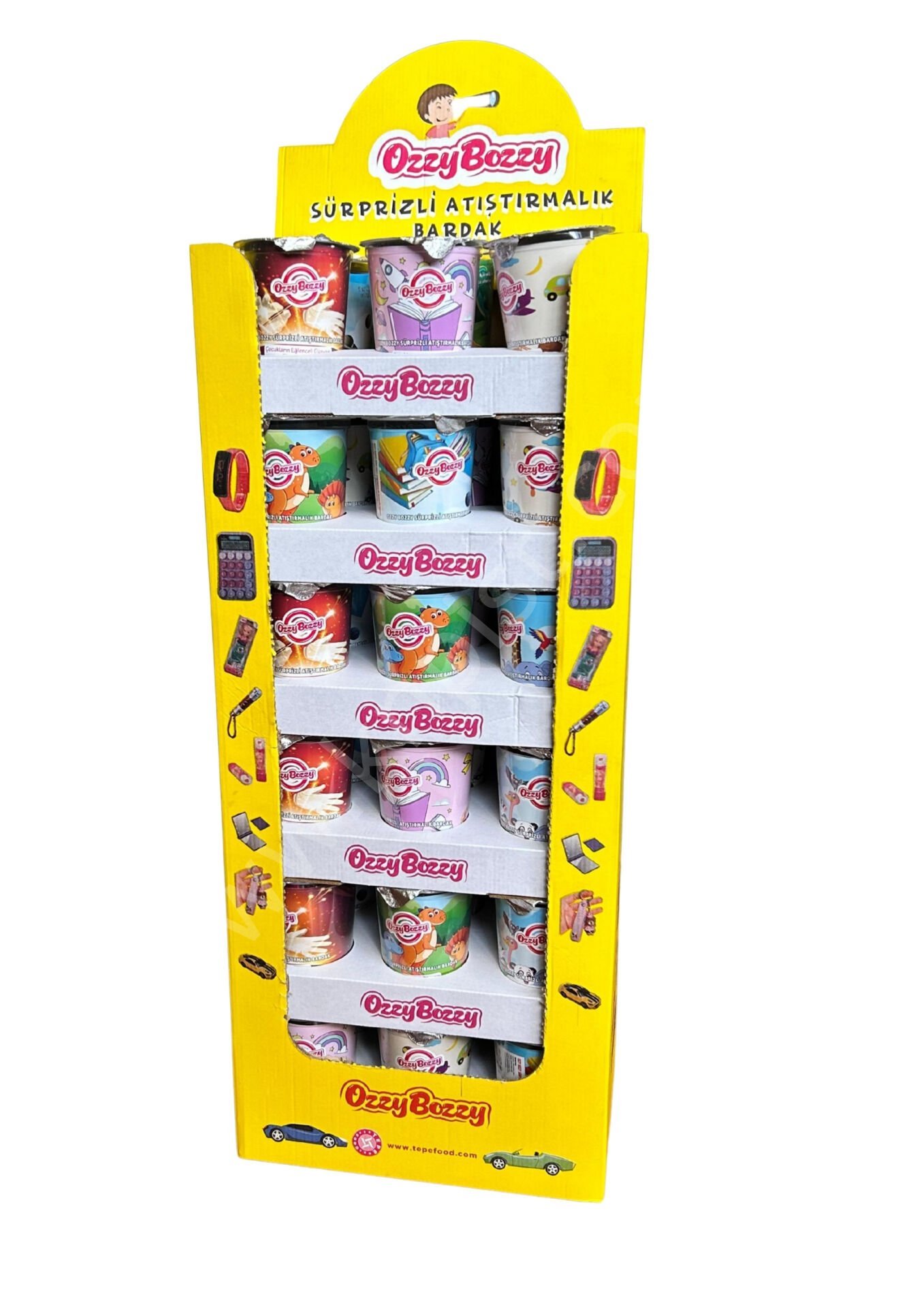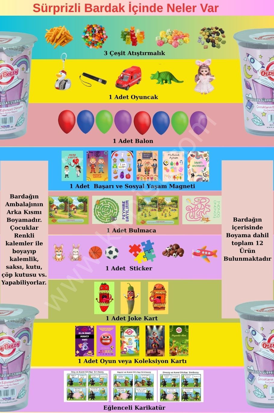Sürprizli Bardak içinde hem atıştırmalıklar hem de oyuncaklar, kartlar, magnetler, stickerler var.